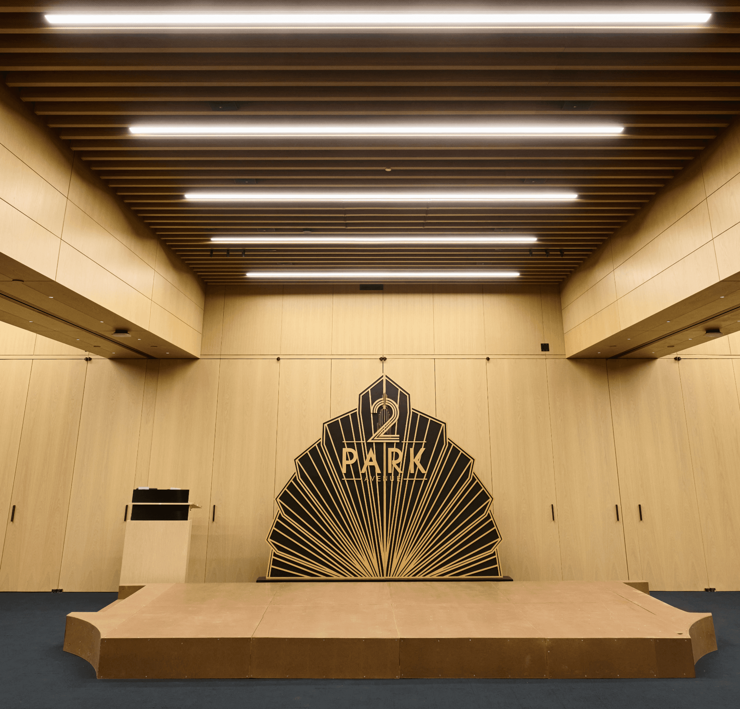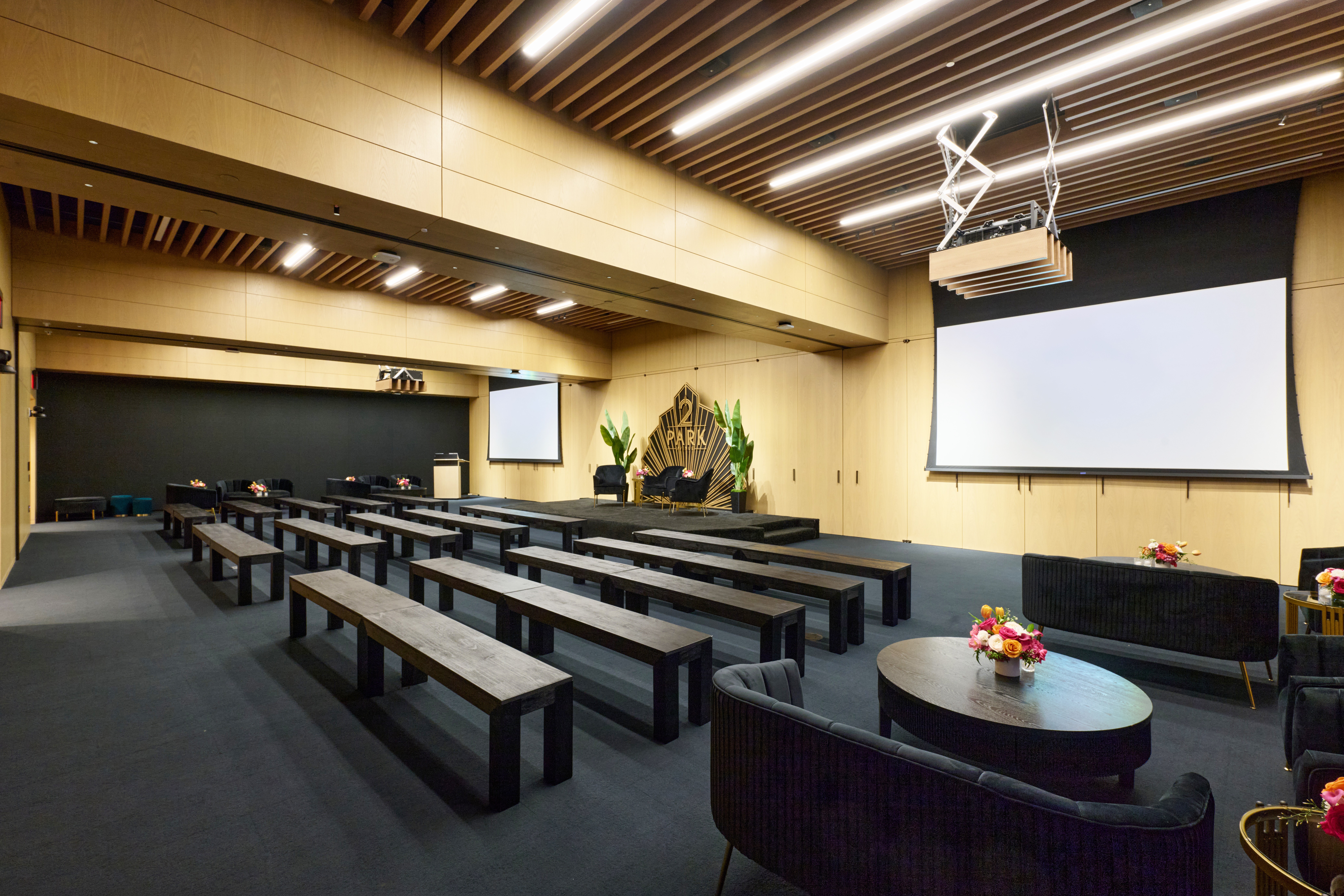 The conference center offers configurable event space entered through a private 33rd Street entrance that keeps arrivals smooth and separate from the main building. Inside: a reception lounge, spirits and coffee bar, dedicated catering kitchen, a 25+ person boardroom and a main room for 180+ guests with movable walls that flex the layout to your event.